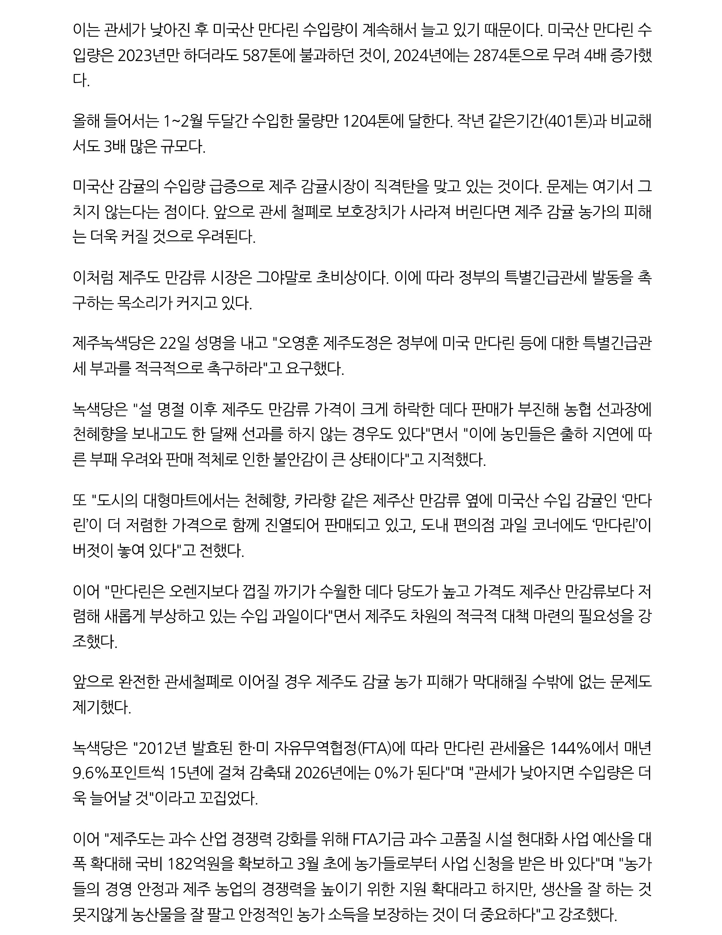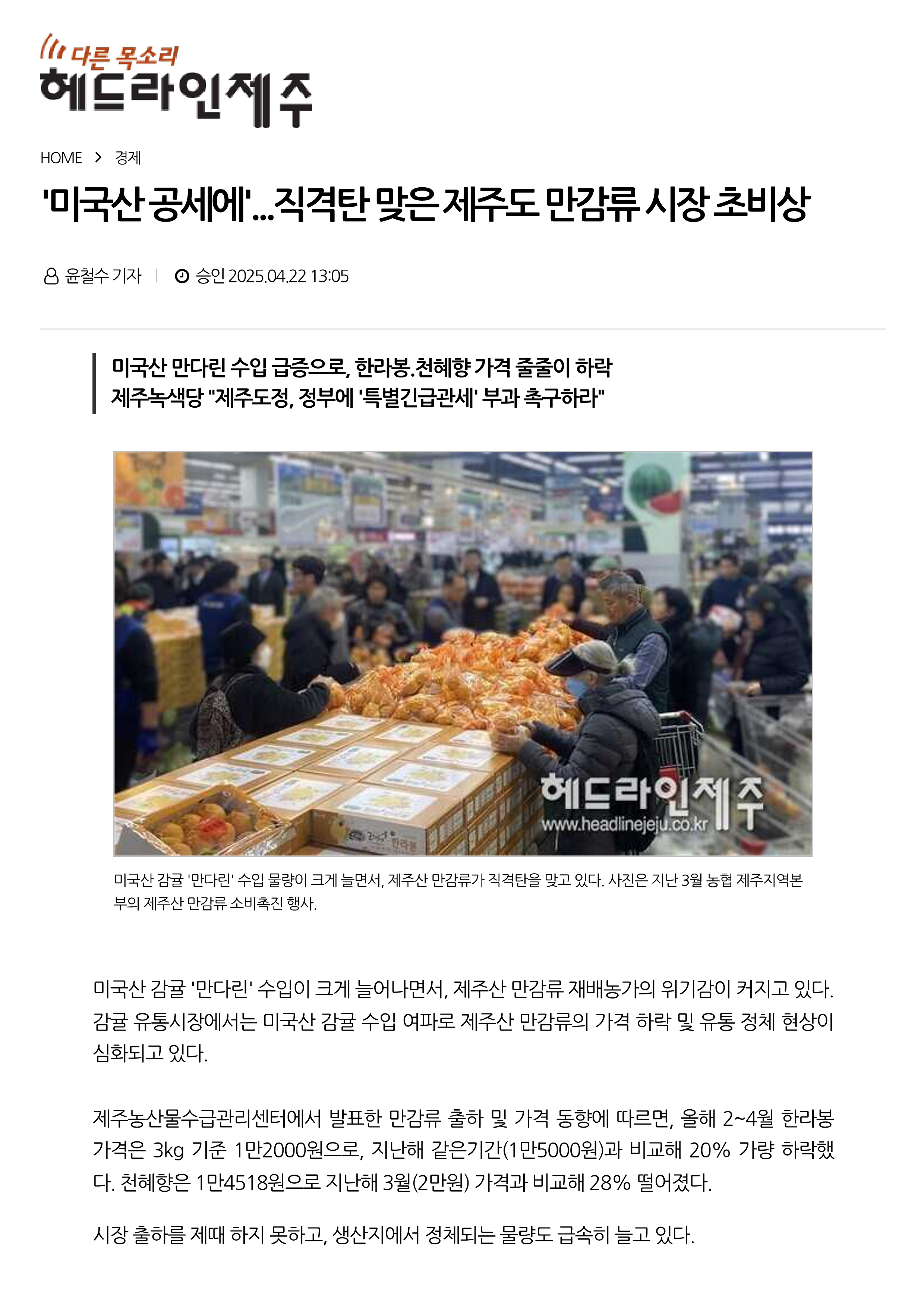 '미국산 공세에'...직격탄 맞은 제주도 만감류 시장 초비상