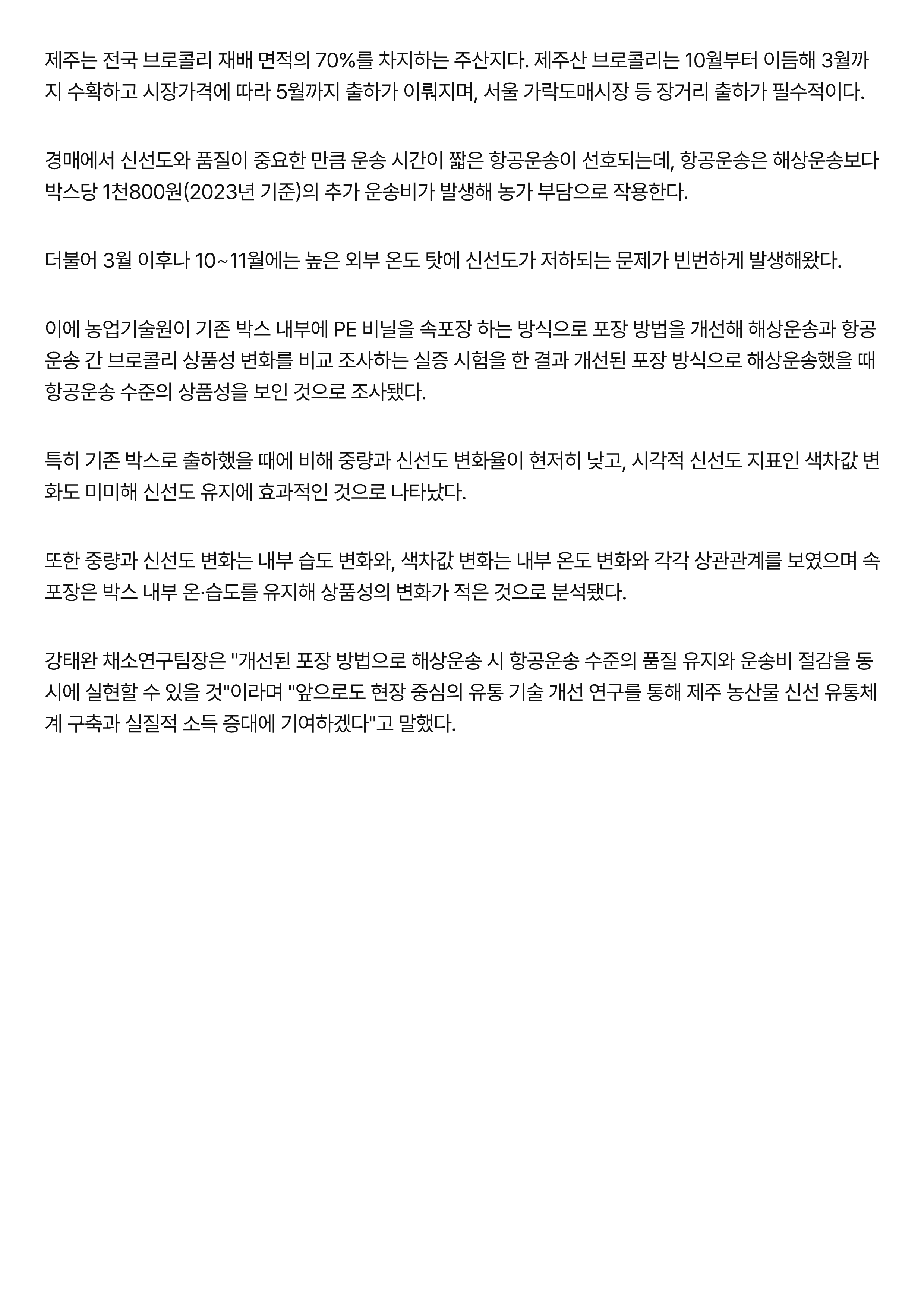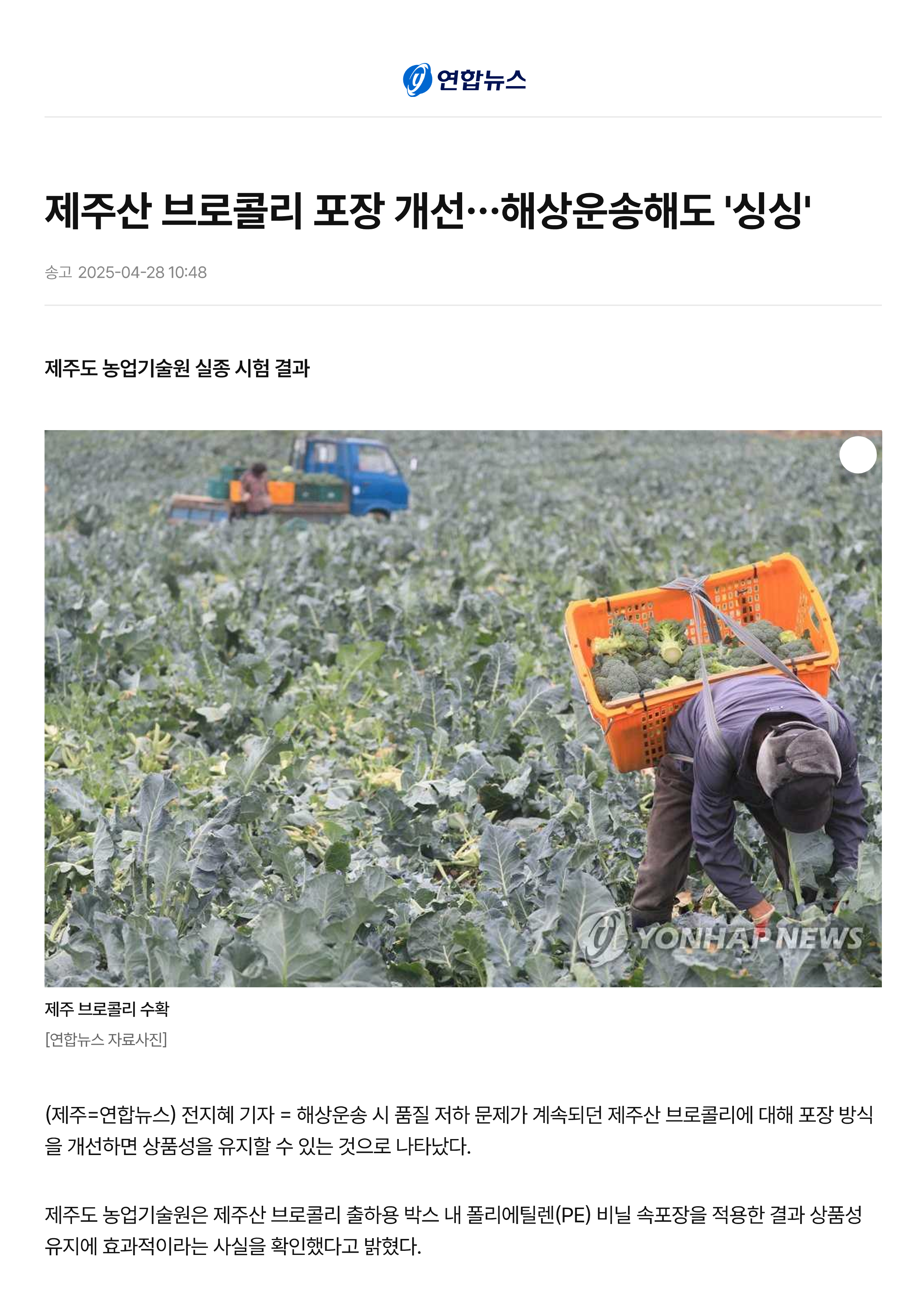 제주산 브로콜리 포장 개선···해상운송에도 '싱싱'