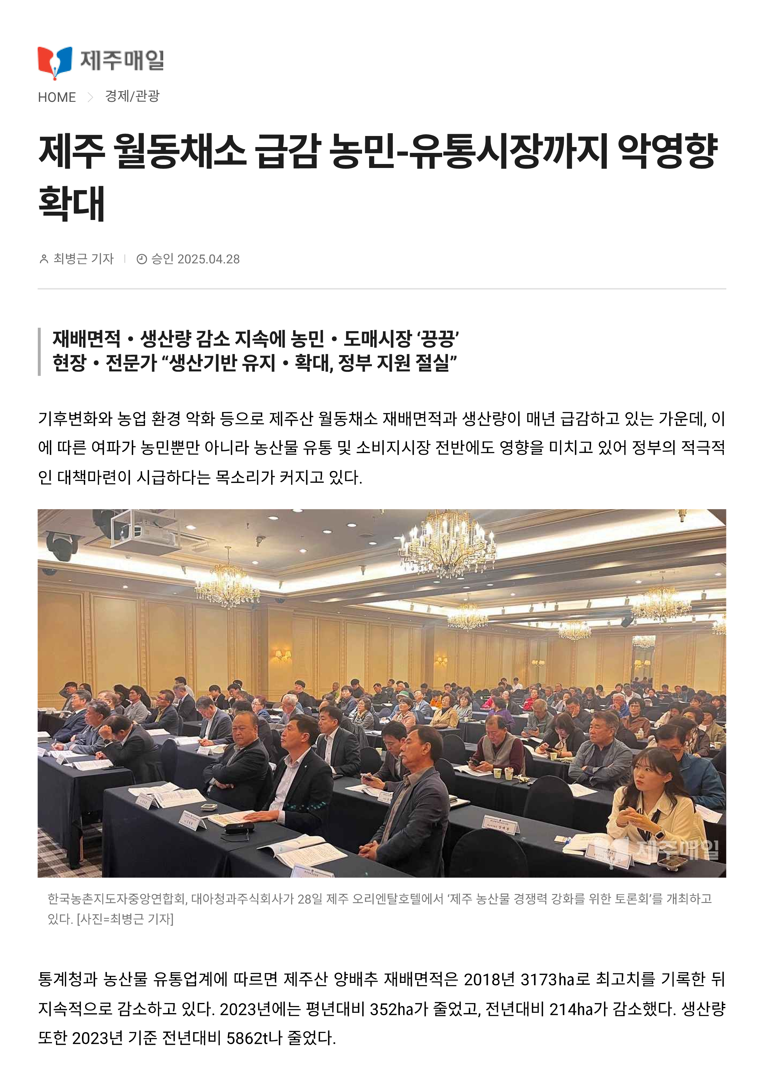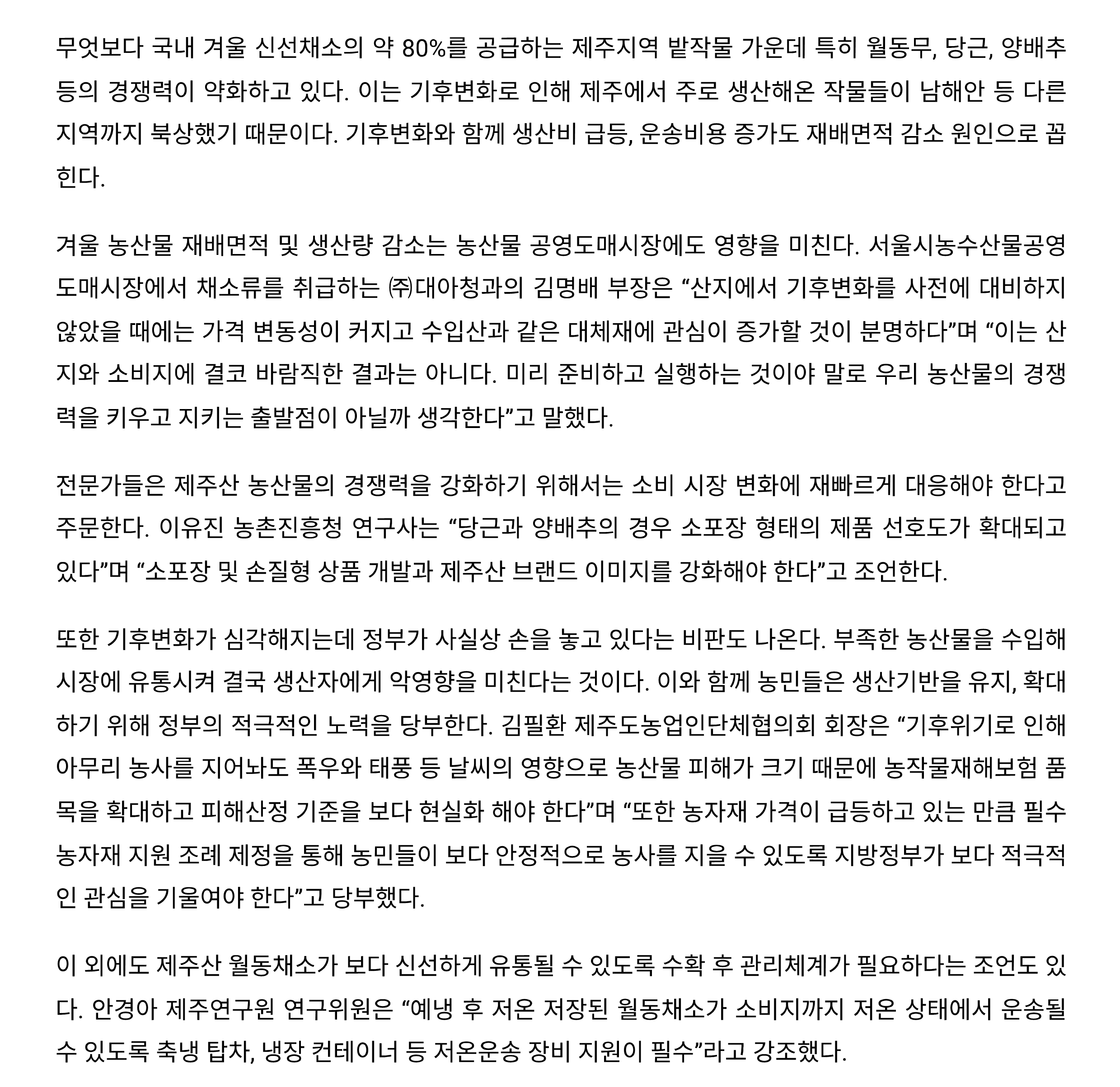 제주 월동채소 급감 농민-유통시장까지 악영향 확대