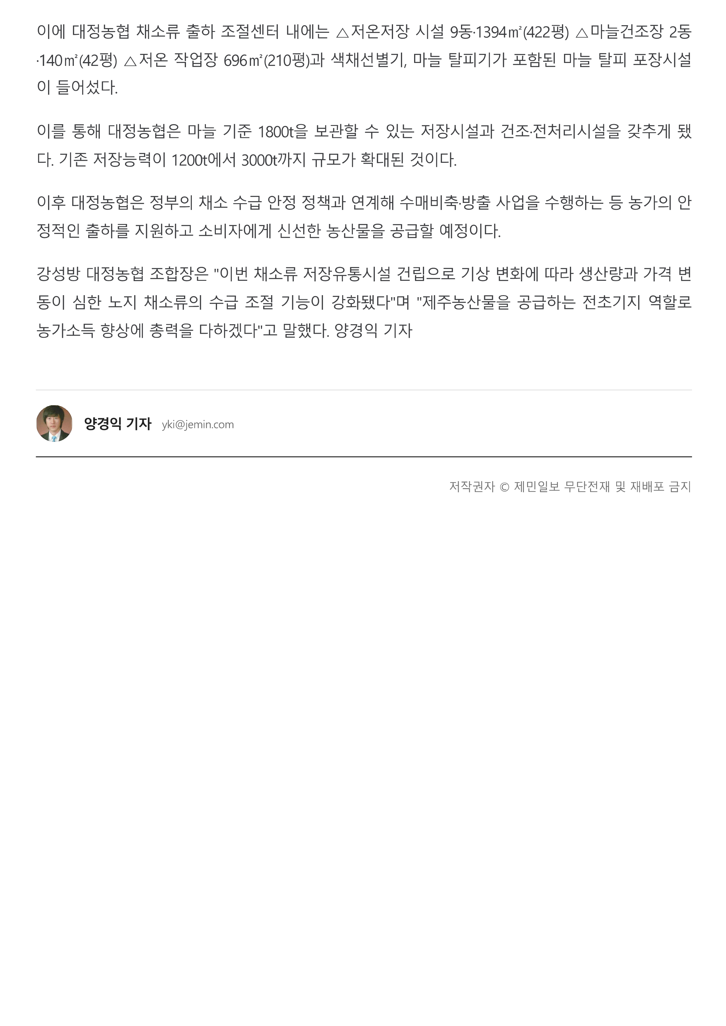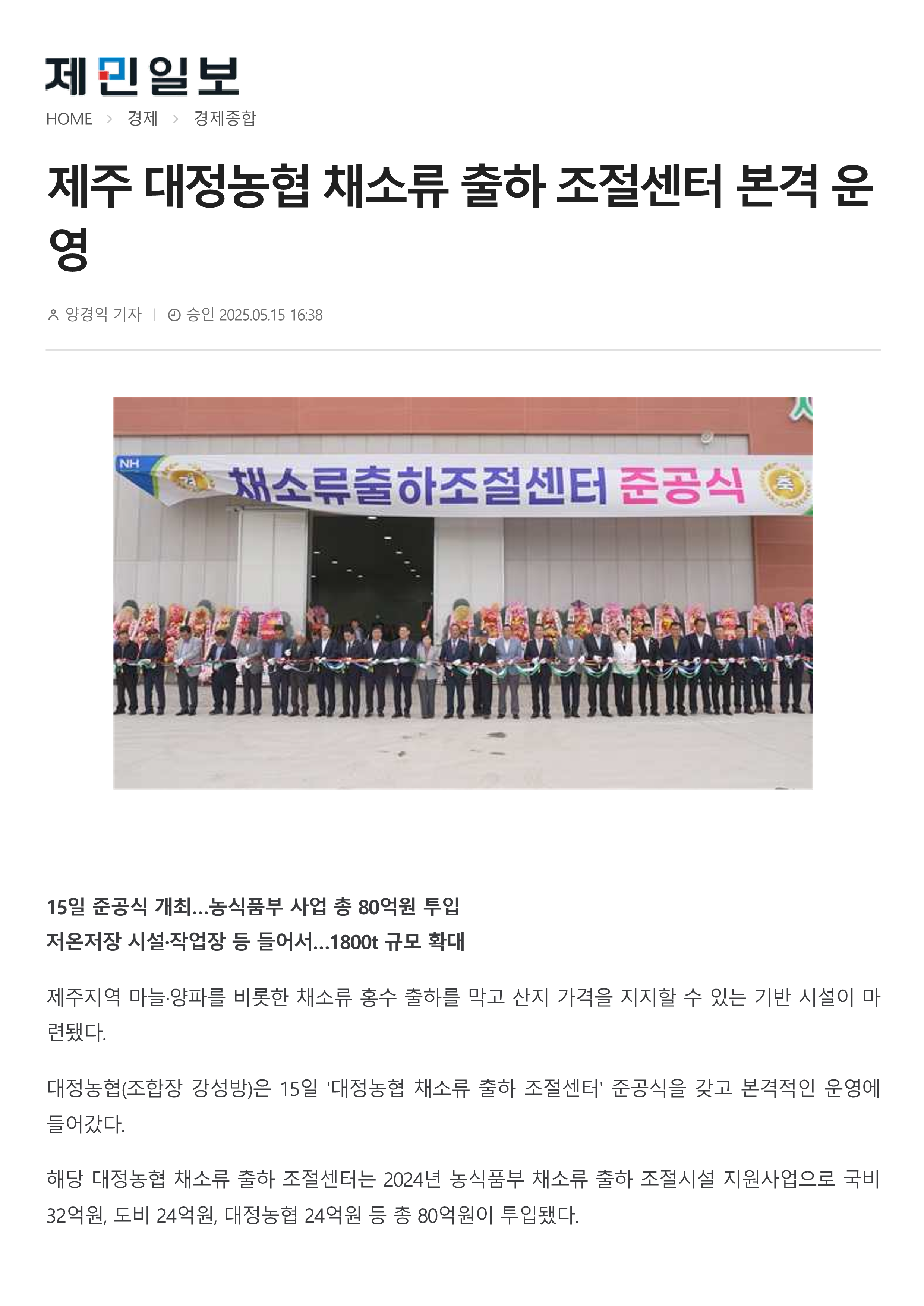 제주 대정농협 채소류 출하 조절센터 본격 운영