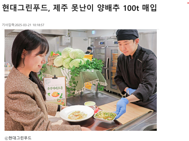 현대그린푸드가 제주산 저탄소 양배추 매입에 나선 것은 작황 악화로 생산량이 감소해 가 격이 오른 상황에서, 값싼 중국산 양배추 수입이 늘며 농가가 판로 확보에 어려움을 겪고 있 기 때문이다.