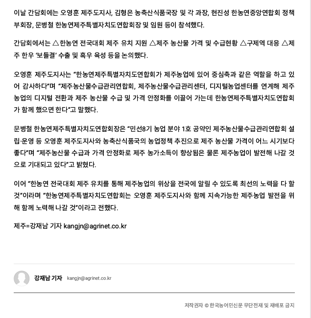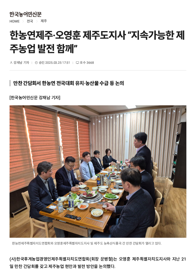 한농연제주·오영훈 제주도지사"지속가능한 제주농업 발전 함께"(25.03.25.)