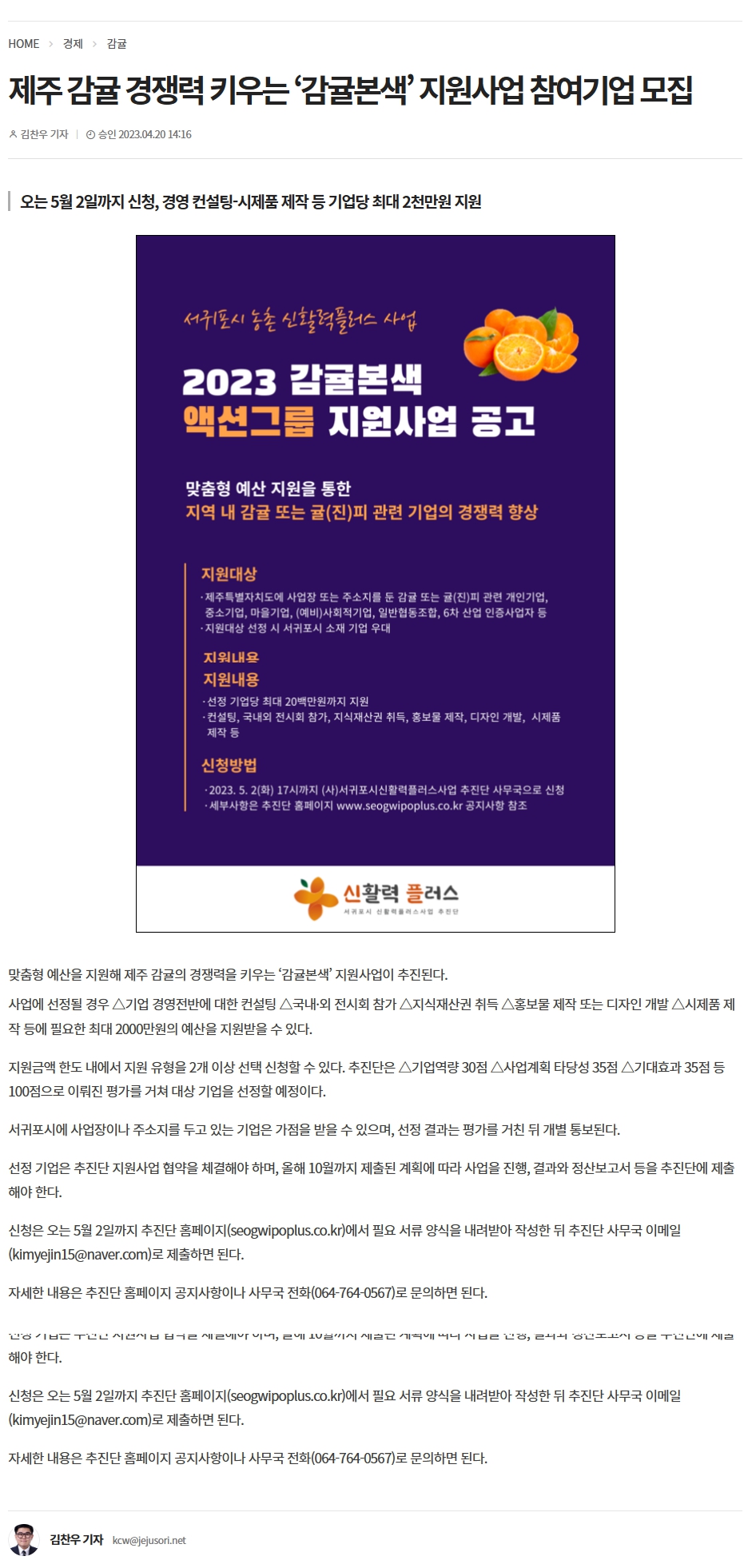 제주 감귤 경쟁력 키우는 ‘감귤본색’ 지원사업 참여기업 모집