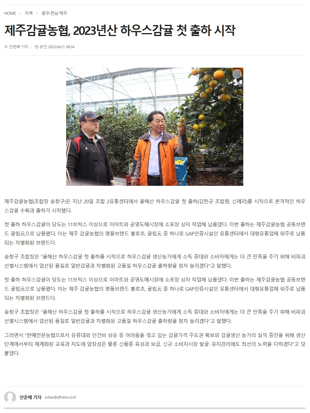 제주감귤농협, 2023년산 하우스감귤 첫 출하 시작