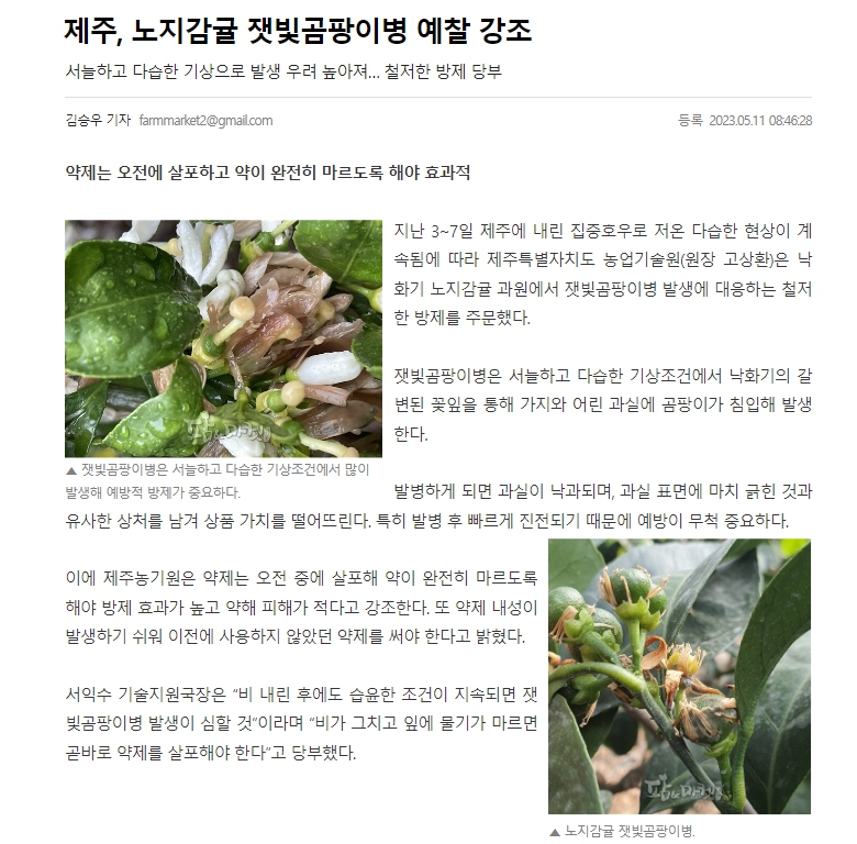 제주, 노지감귤 잿빛곰팡이병 예찰 강조