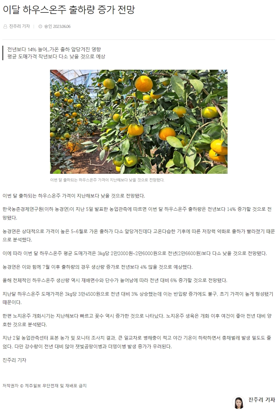 이달 하우스온주 출하량 증가 전망