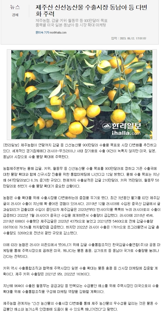 제주산 신선농산물 수출시장 동남아 등 다변화 주력