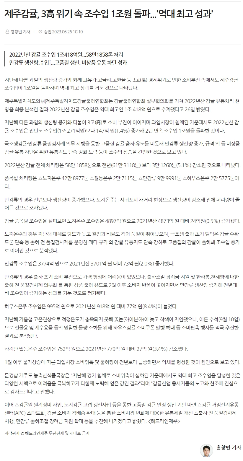 2184 | 제주 노지감귤, 당도 10브릭스 이상이면 '커도 작아도'출하 | 2 | 총무기획부 | 2025-10-16 | 67 |