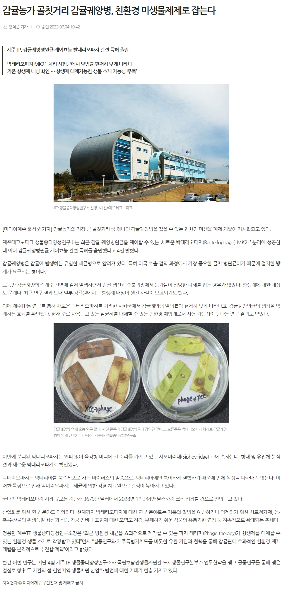 감귤농가 골칫거리 감귤궤양병, 친환경 미생물제제로 잡는다