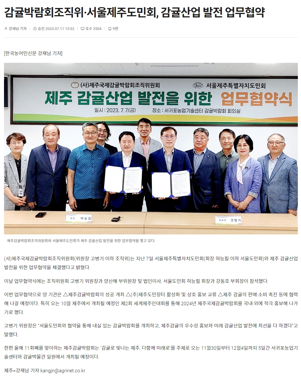 감귤박람회조직위·서울제주도민회, 감귤산업 발전 업무협약