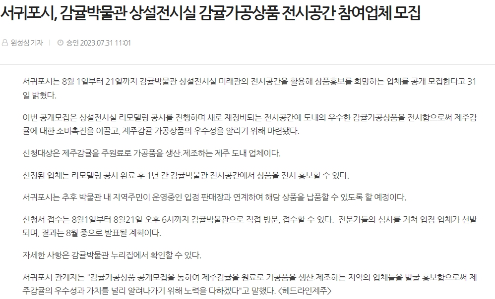 서귀포시, 감귤박물관 상설전시실 감귤가공상품 전시공간 참여업체 모집