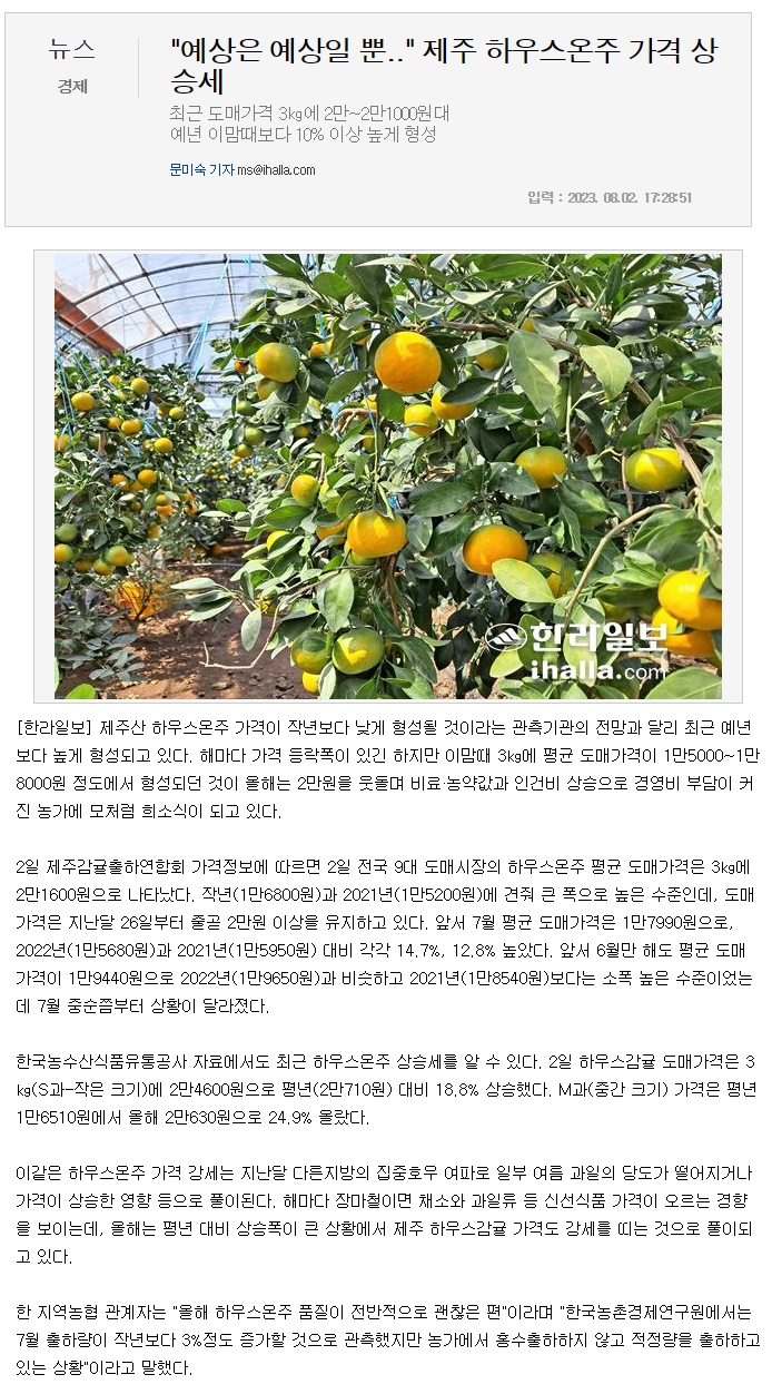 "예상은 예상일 뿐.." 제주 하우스온주 가격 상승세