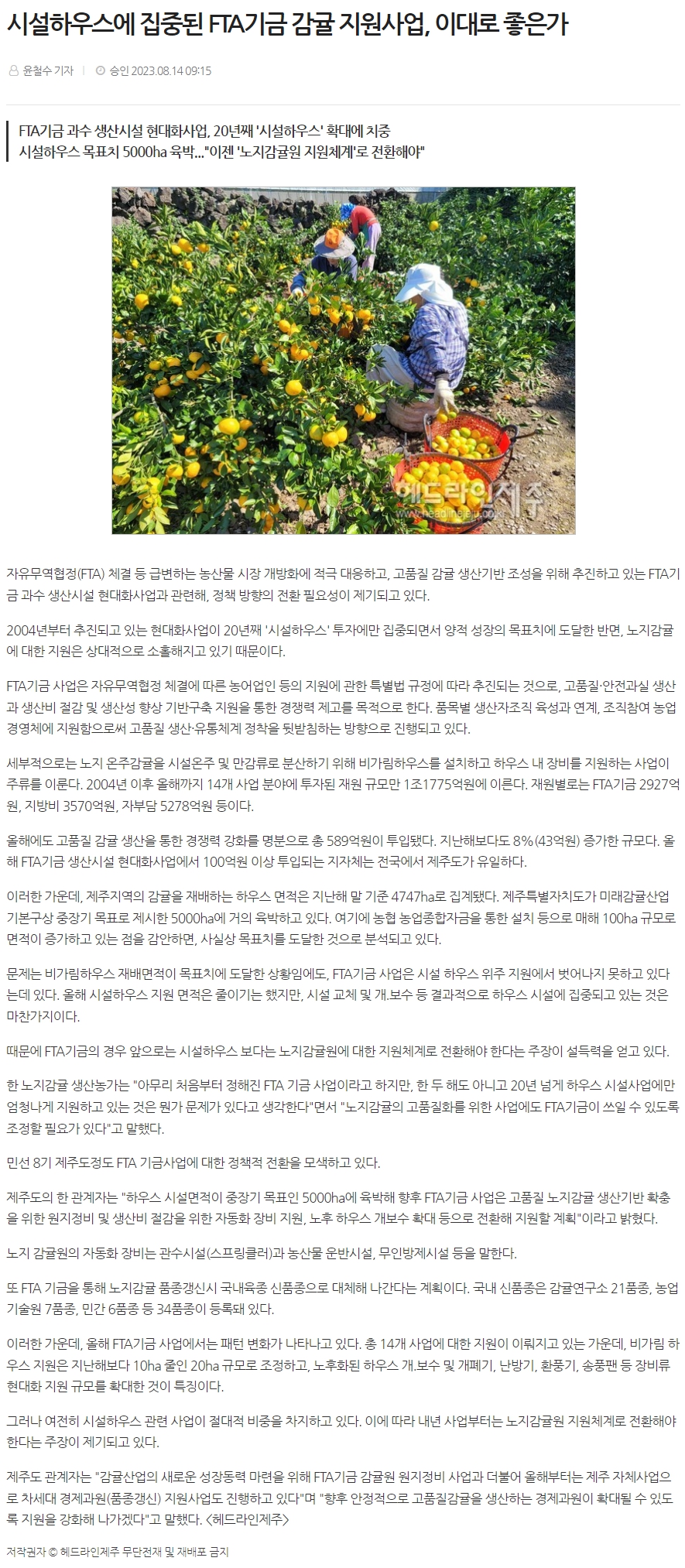 시설하우스에 집중된 FTA기금 감귤 지원사업, 이대로 좋은가