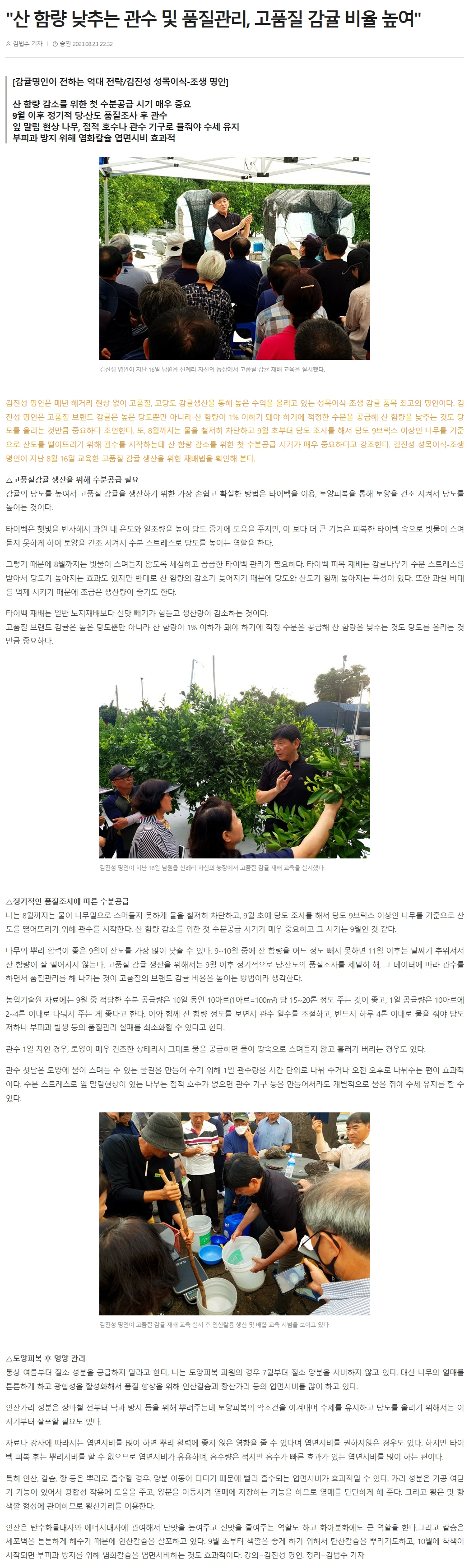 "산 함량 낮추는 관수 및 품질관리, 고품질 감귤 비율 높여"