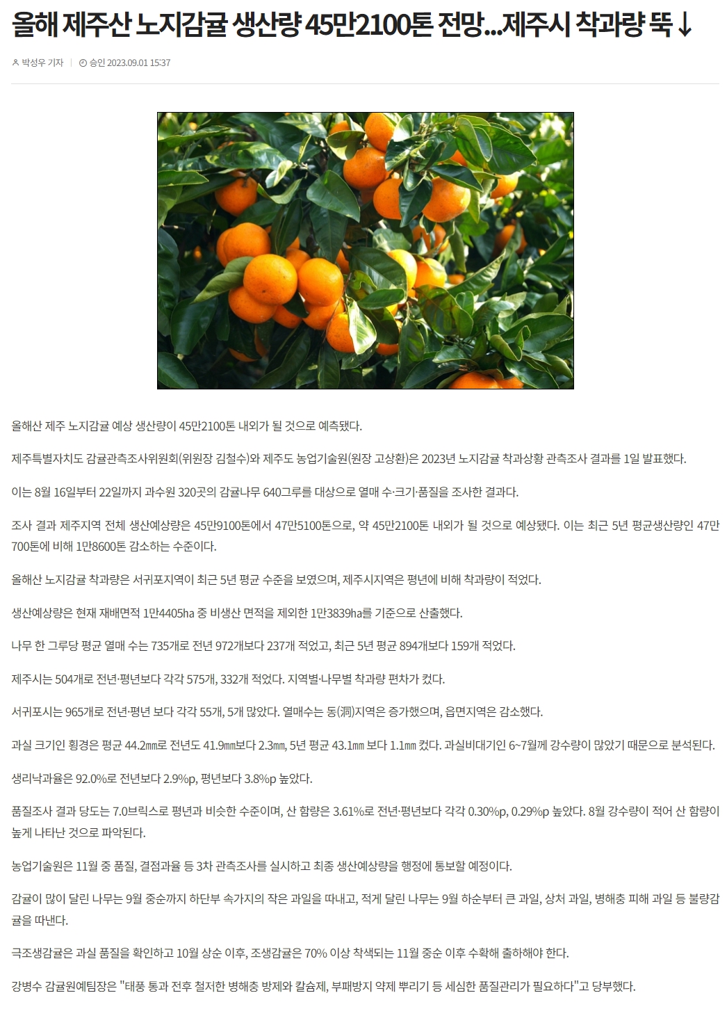 2184 | 제주 노지감귤, 당도 10브릭스 이상이면 '커도 작아도'출하 | 2 | 총무기획부 | 2025-10-16 | 60 |