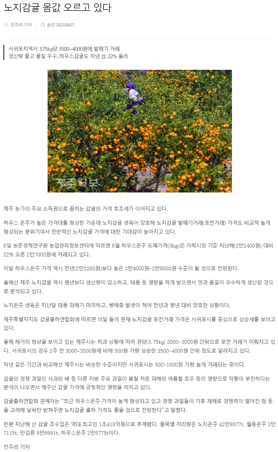 노지감귤 몸값 오르고 있다