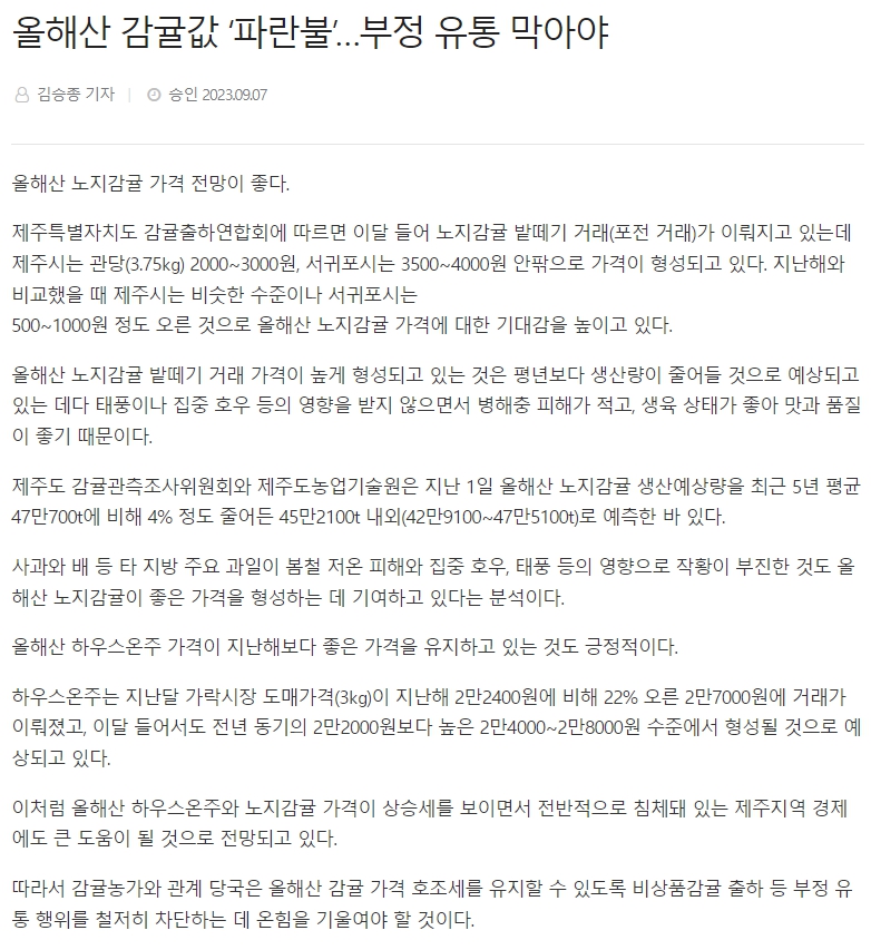 올해산 감귤값 ‘파란불’…부정 유통 막아야