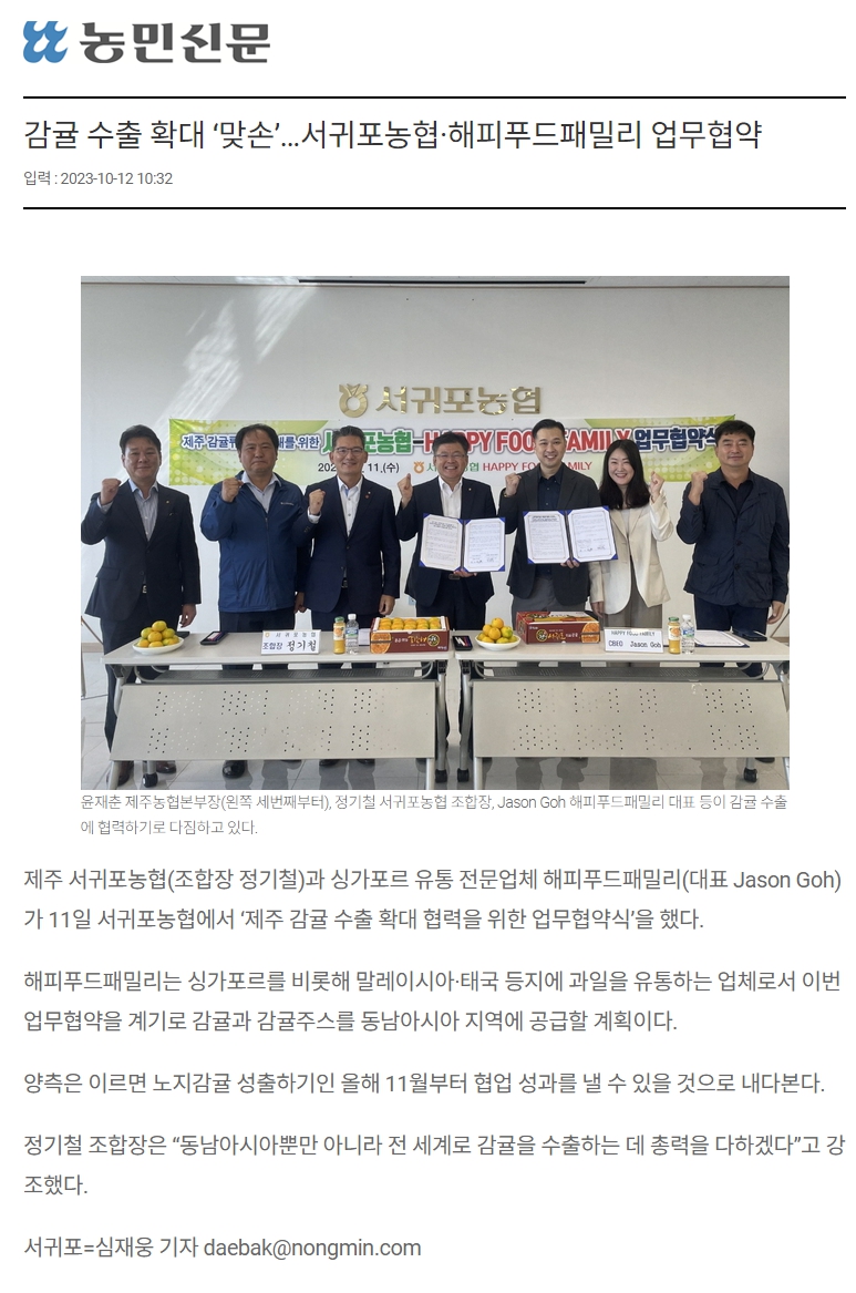 감귤 수출 확대 ‘맞손’…서귀포농협·해피푸드패밀리 업무협약