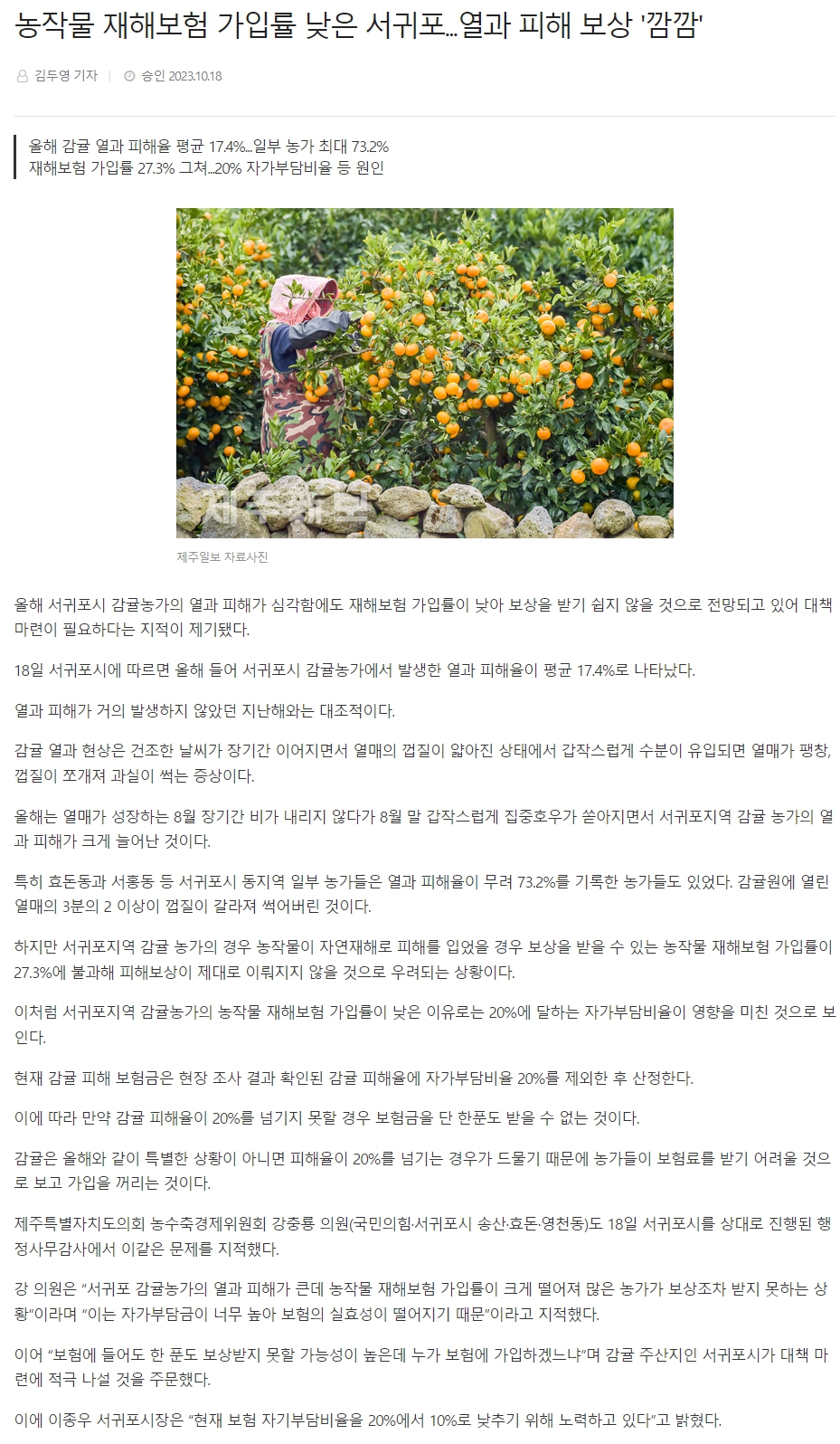 농작물 재해보험 가입률 낮은 서귀포...열과 피해 보상 '깜깜'