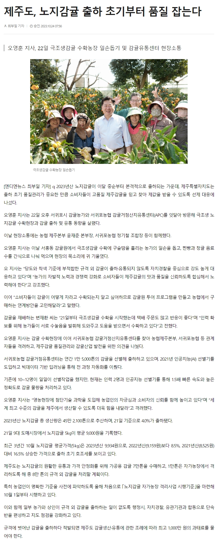 제주도, 노지감귤 출하 초기부터 품질 잡는다
