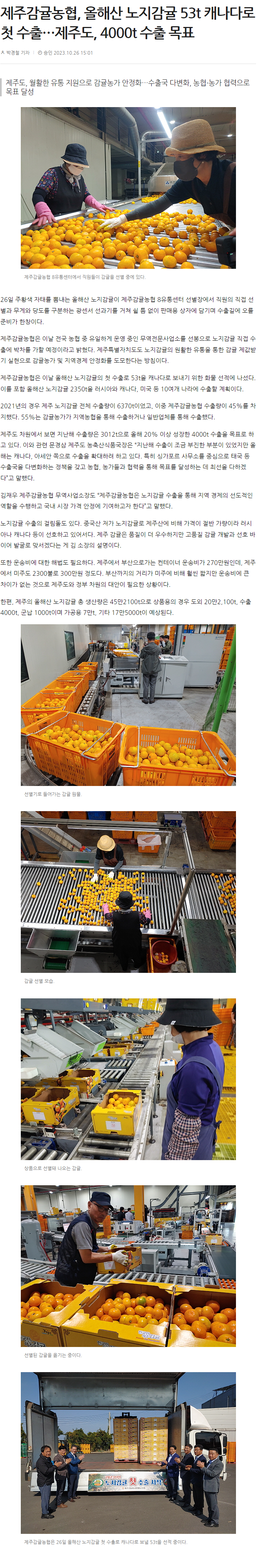 제주감귤농협, 올해산 노지감귤 53t 캐나다로 첫 수출…제주도, 4000t 수출 목표