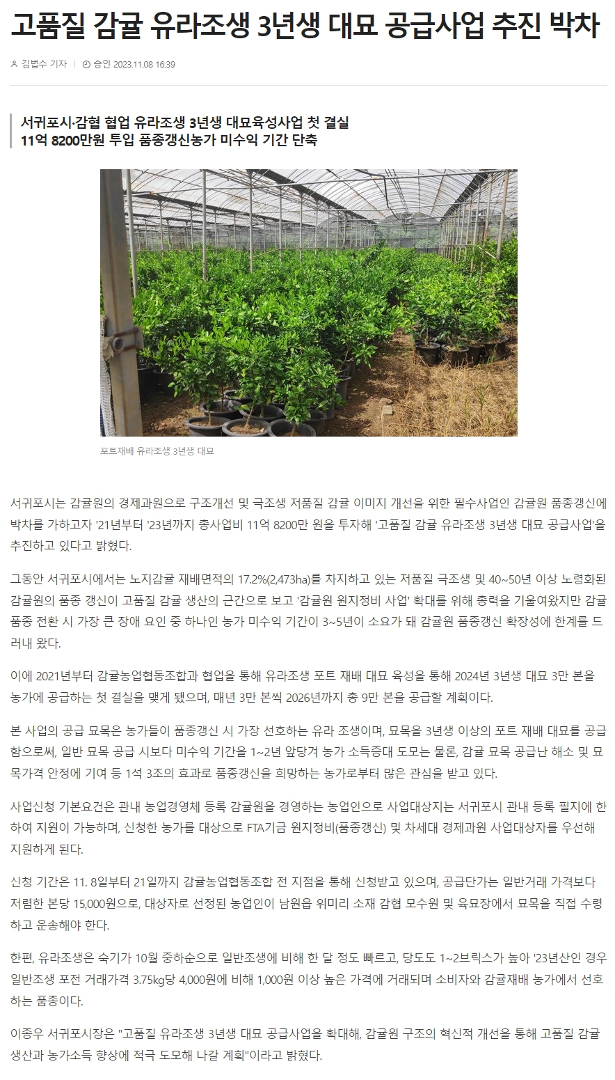 고품질 감귤 유라조생 3년생 대묘 공급사업 추진 박차
