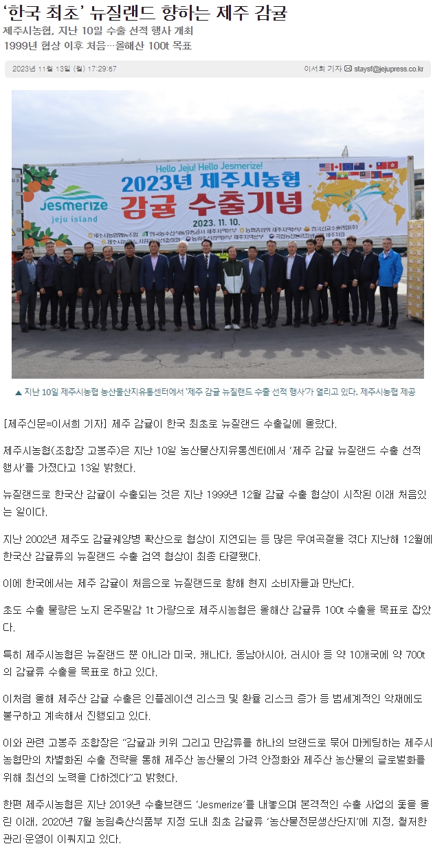 ‘한국 최초’ 뉴질랜드 향하는 제주 감귤