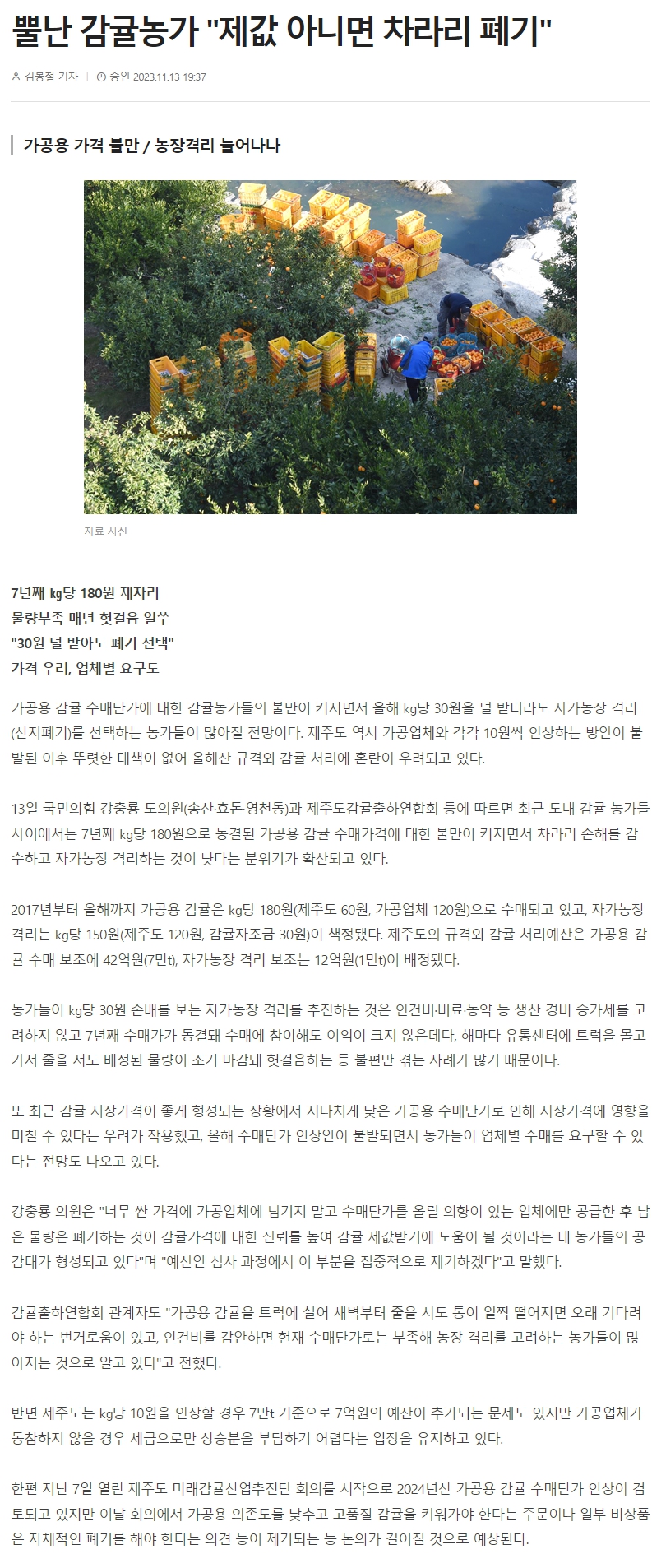 뿔난 감귤농가 "제값 아니면 차라리 폐기"