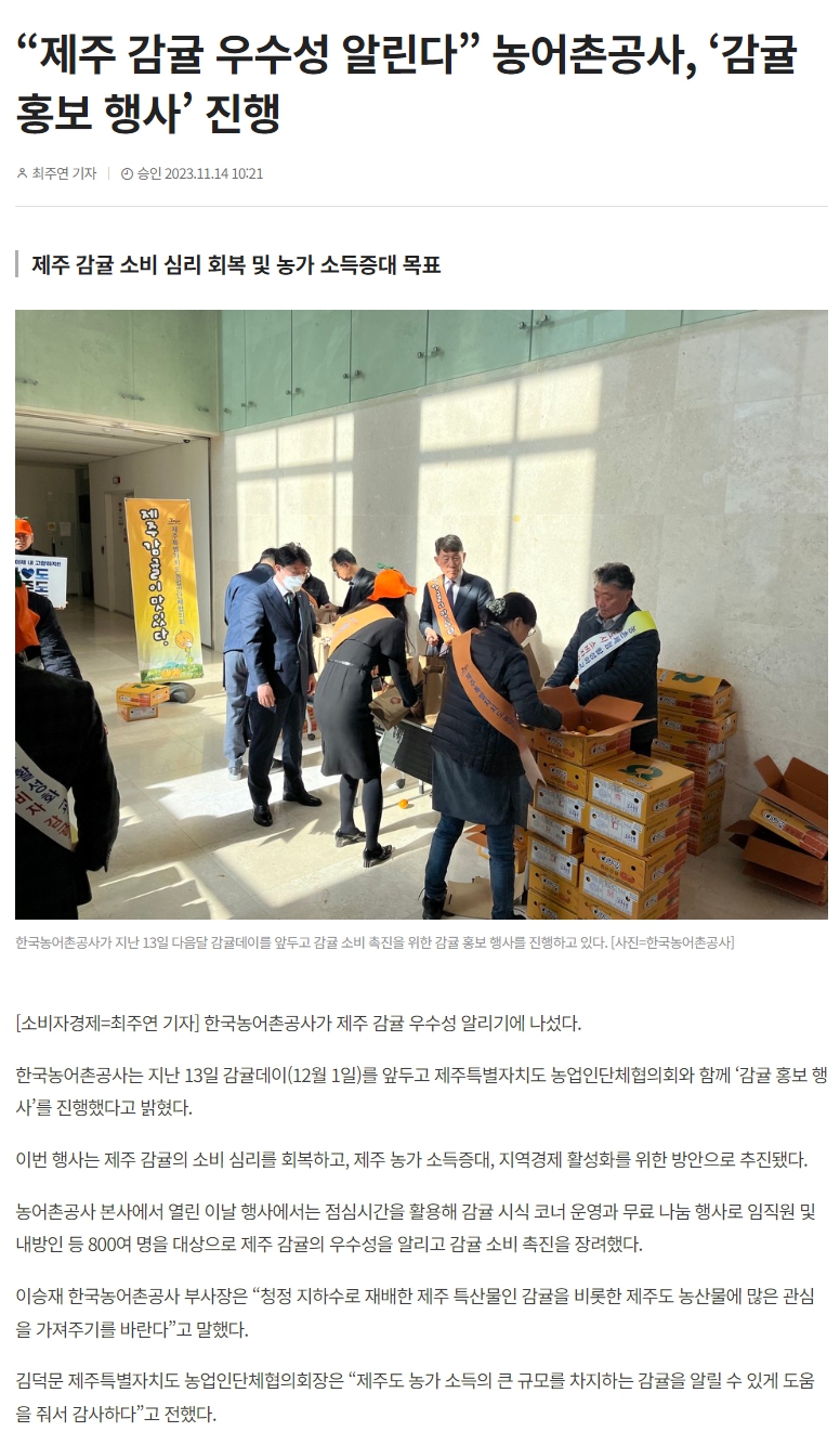 “제주 감귤 우수성 알린다” 농어촌공사, ‘감귤 홍보 행사’ 진행