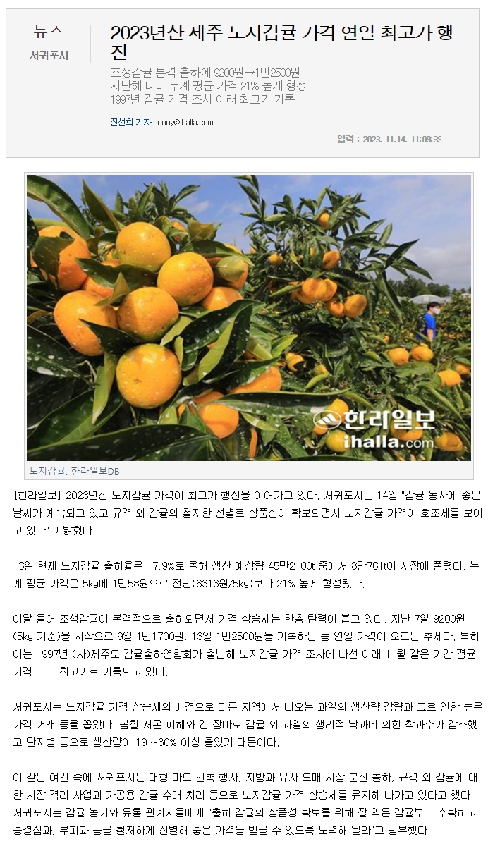 2023년산 제주 노지감귤 가격 연일 최고가 행진