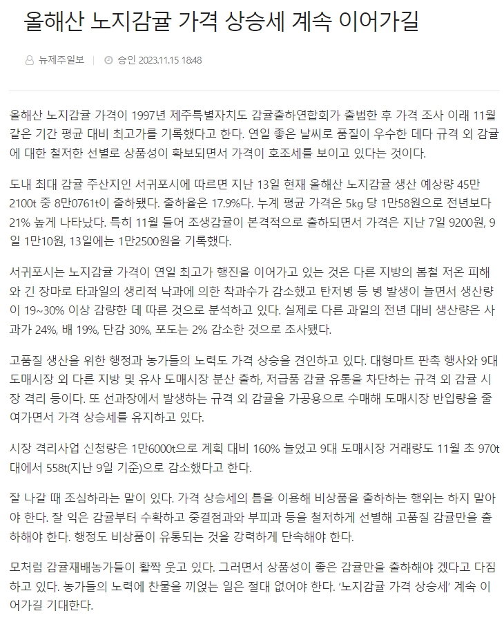 올해산 노지감귤 가격 상승세 계속 이어가길