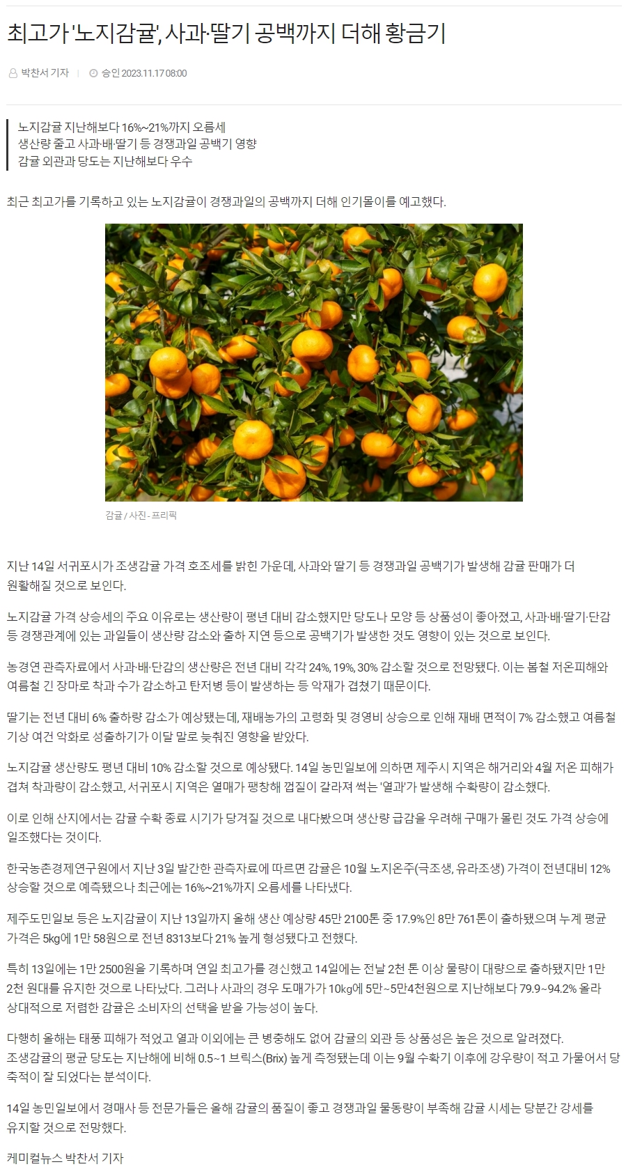 최고가 '노지감귤', 사과·딸기 공백까지 더해 황금기