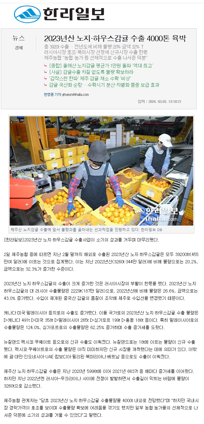 2023년산 노지·하우스감귤 수출 4000톤 육박