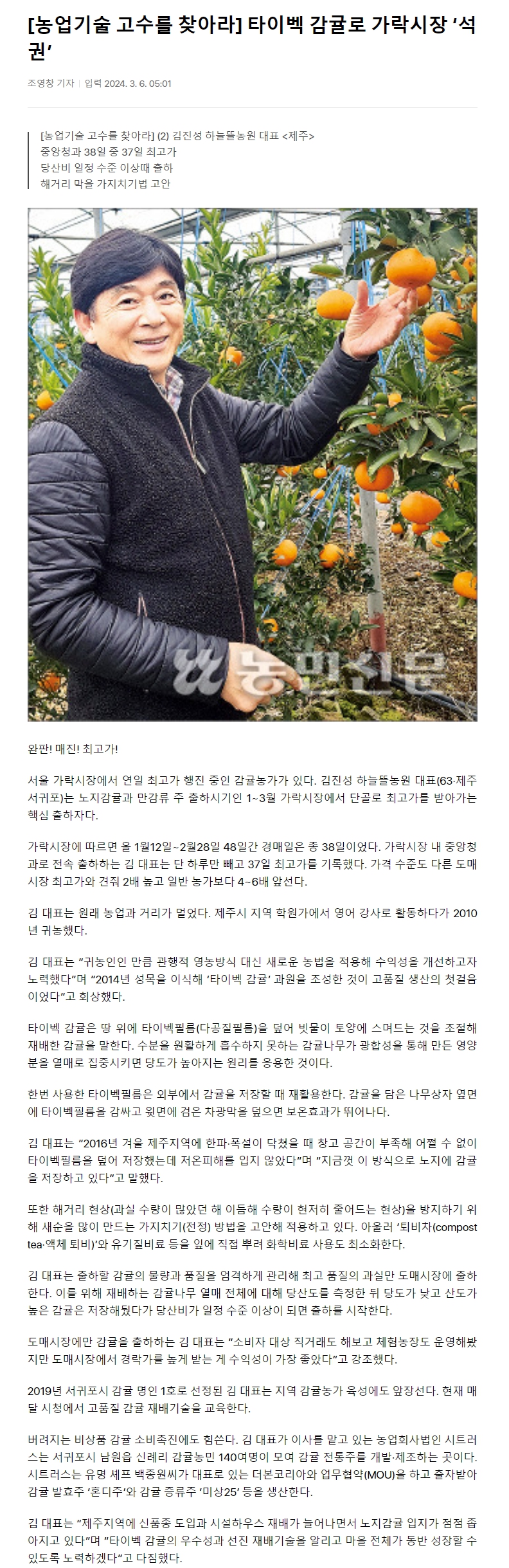 [농업기술 고수를 찾아라] 타이벡 감귤로 가락시장 ‘석권