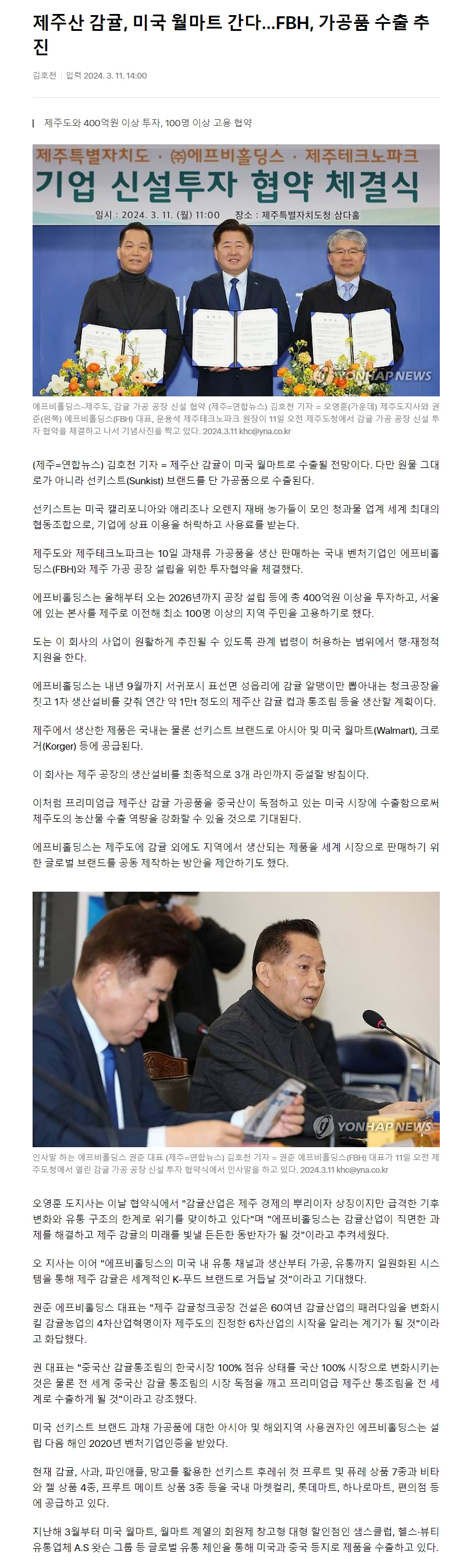 제주산 감귤, 미국 월마트 간다…FBH, 가공품 수출 추진