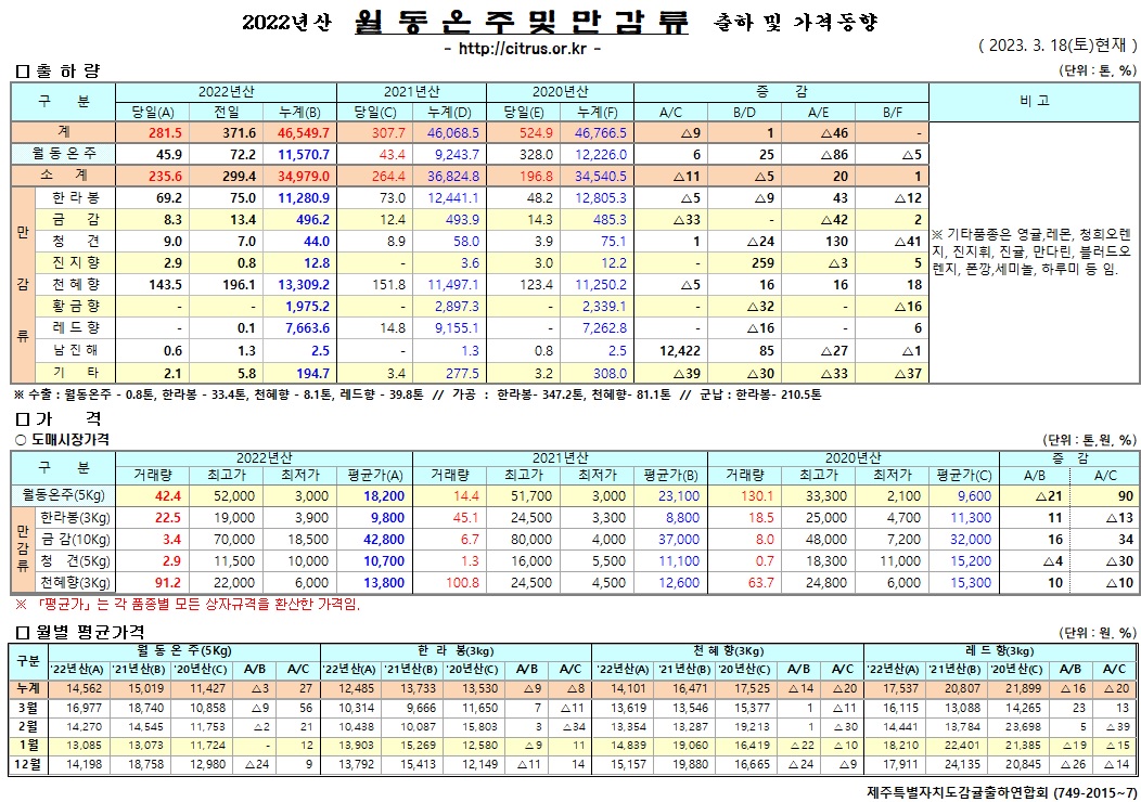 [월동&만감]2022년산 출하 및 가격동향(3/18)