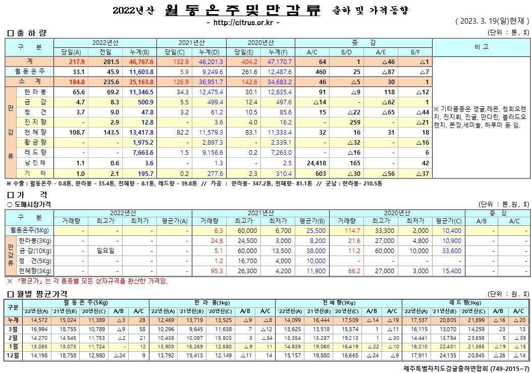 [월동&만감]2022년산 출하 및 가격동향(3/19)