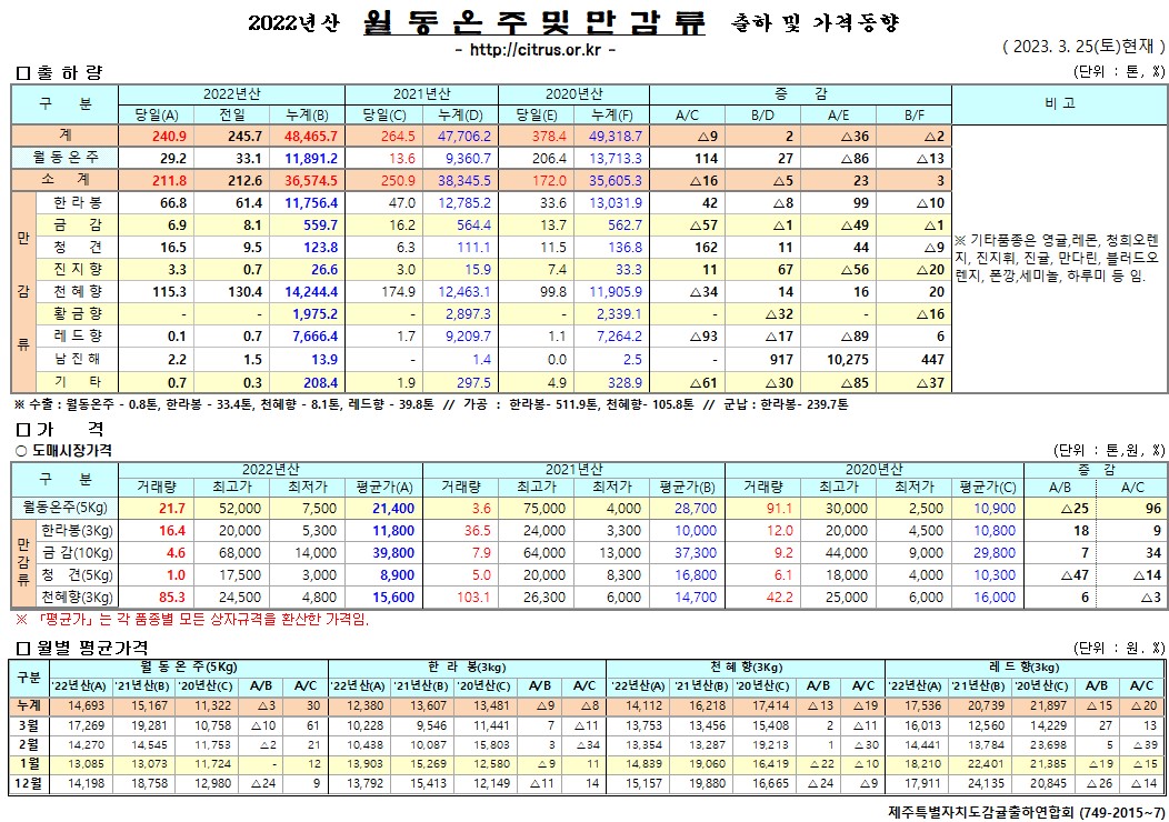 [월동&만감]2022년산 출하 및 가격동향(3/25)