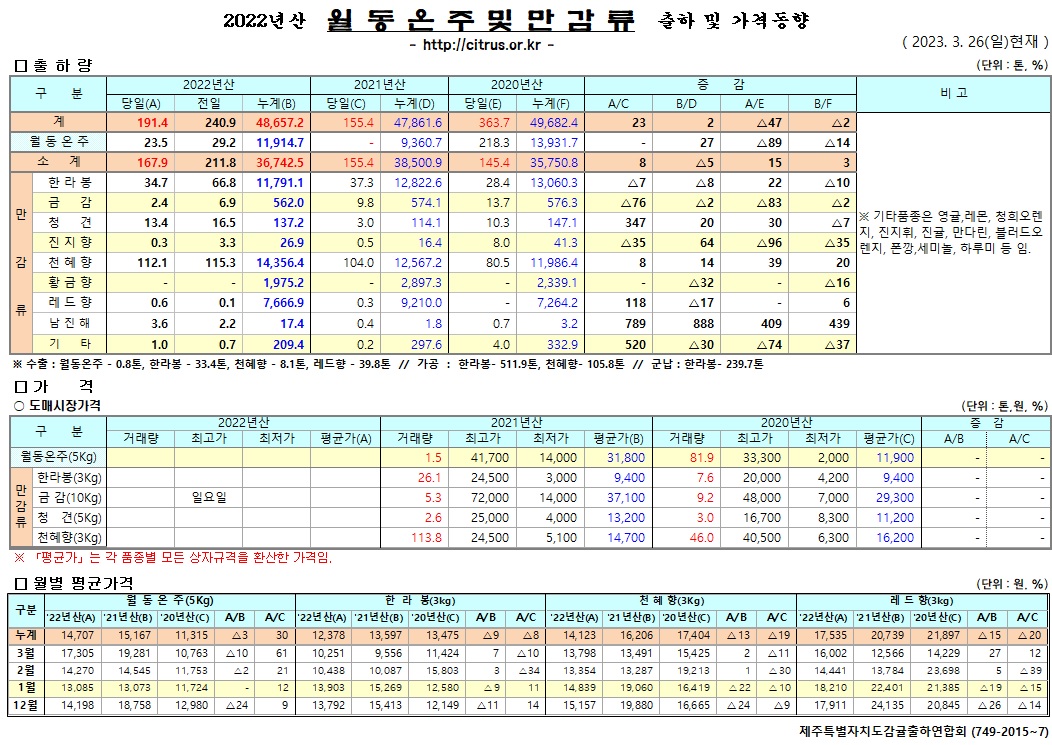 [월동&만감]2022년산 출하 및 가격동향(3/26)