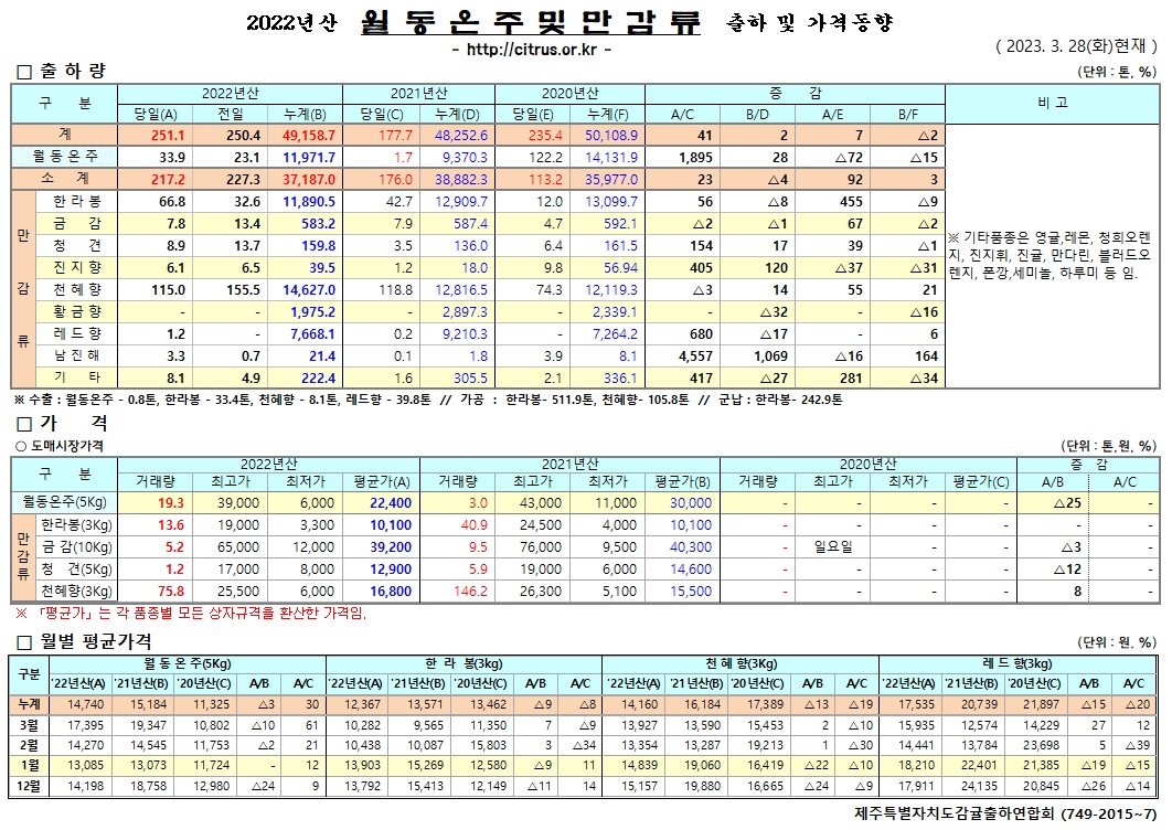 [월동&만감]2022년산 출하 및 가격동향(3/28)
