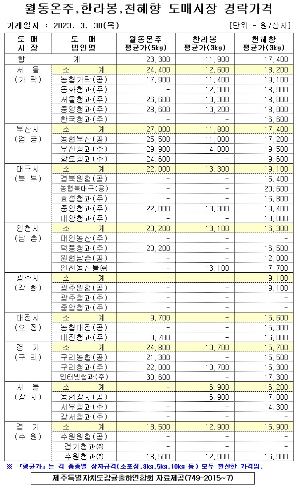 [월동&만감]9대도매시장 경락가격(3/30)