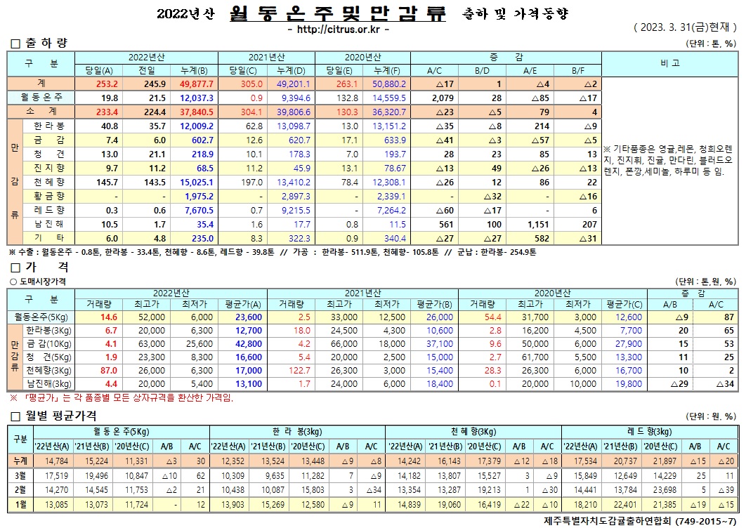 [월동&만감]2022년산 출하 및 가격동향(3/31)