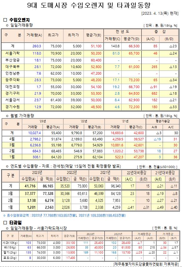 [수입오렌지&타과일]9대도매시장 경락가격(4/13)