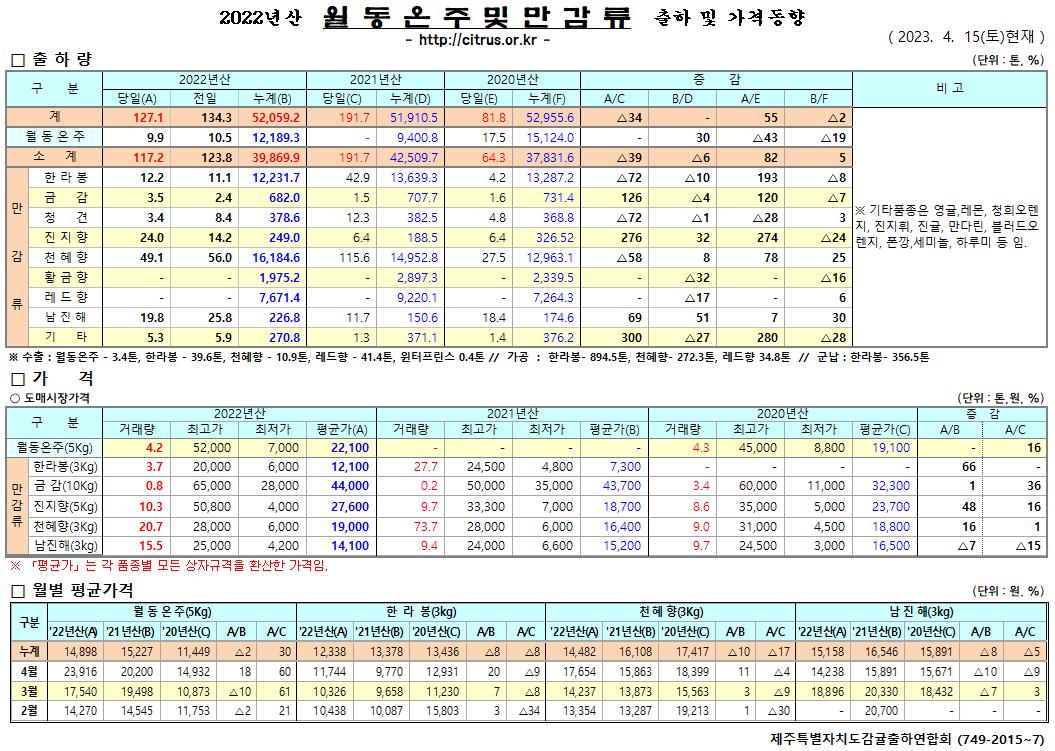 [월동&만감]2022년산 출하 및 가격동향(4/15)