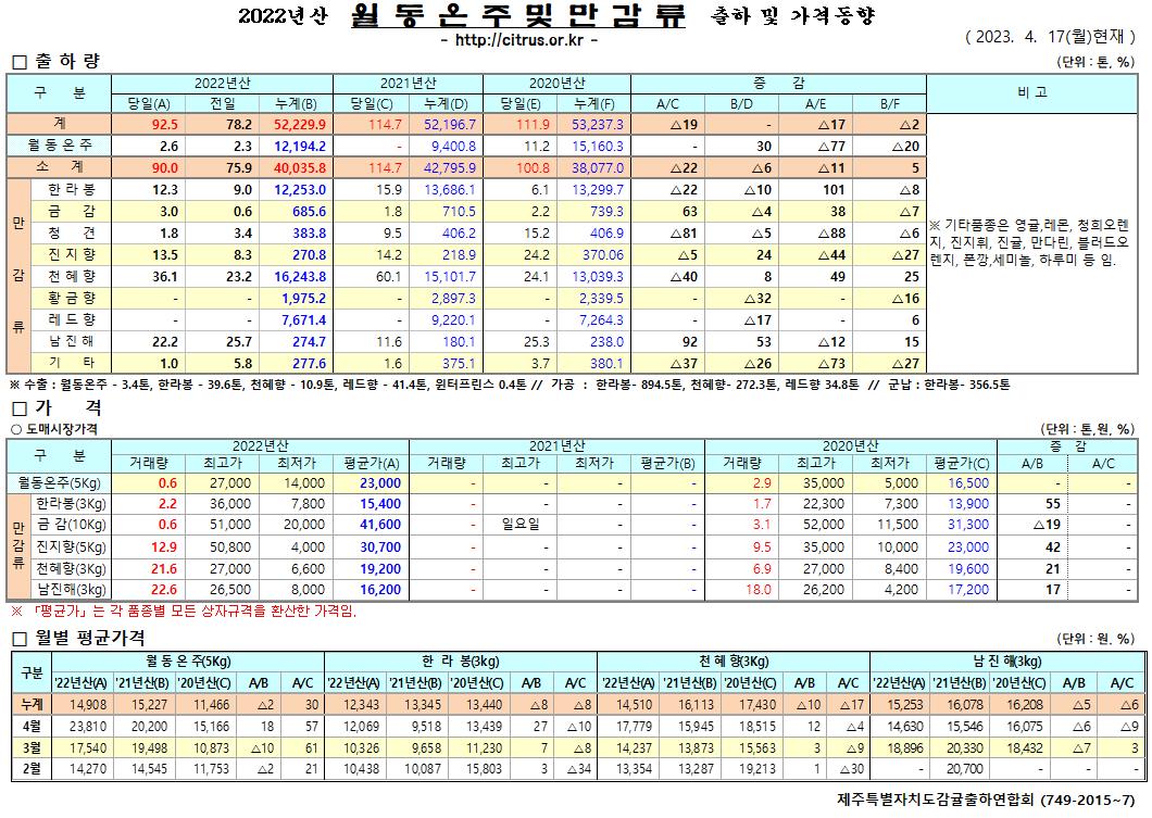 [월동&만감]2022년산 출하 및 가격동향(4/17)