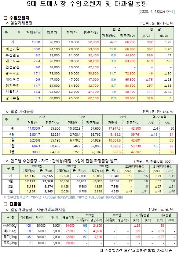 [수입오렌지&타과일]9대도매시장 경락가격(4/18)