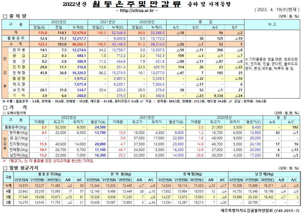 [월동&만감]2022년산 출하 및 가격동향(4/19)