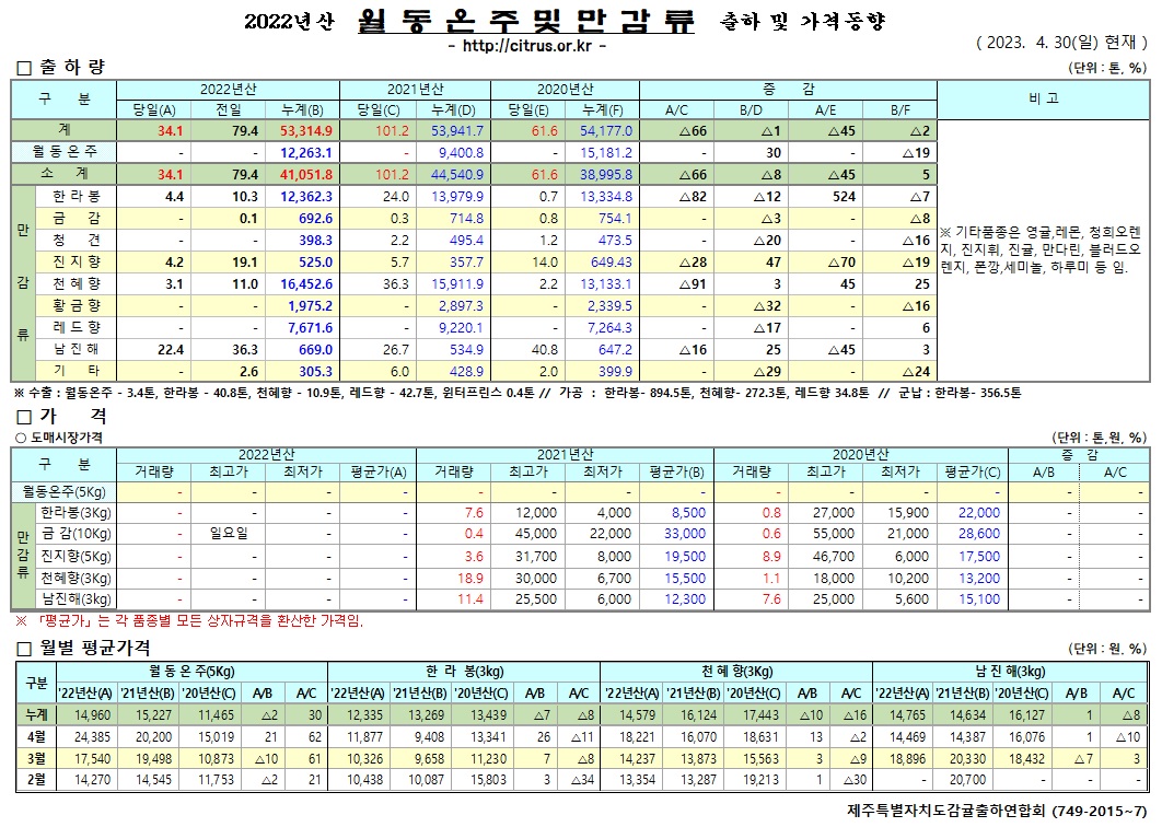 [월동&만감]2022년산 출하 및 가격동향(4/30)
