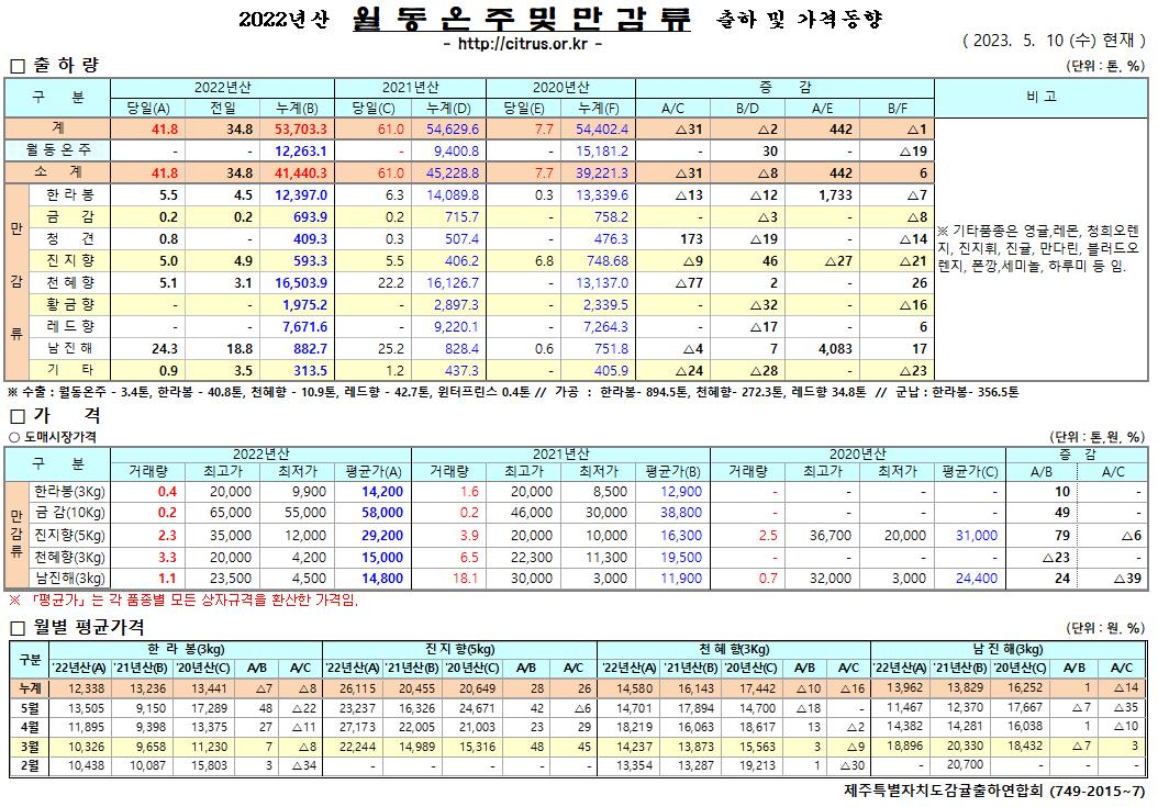 [월동&만감]2022년산 출하 및 가격동향(5/10)