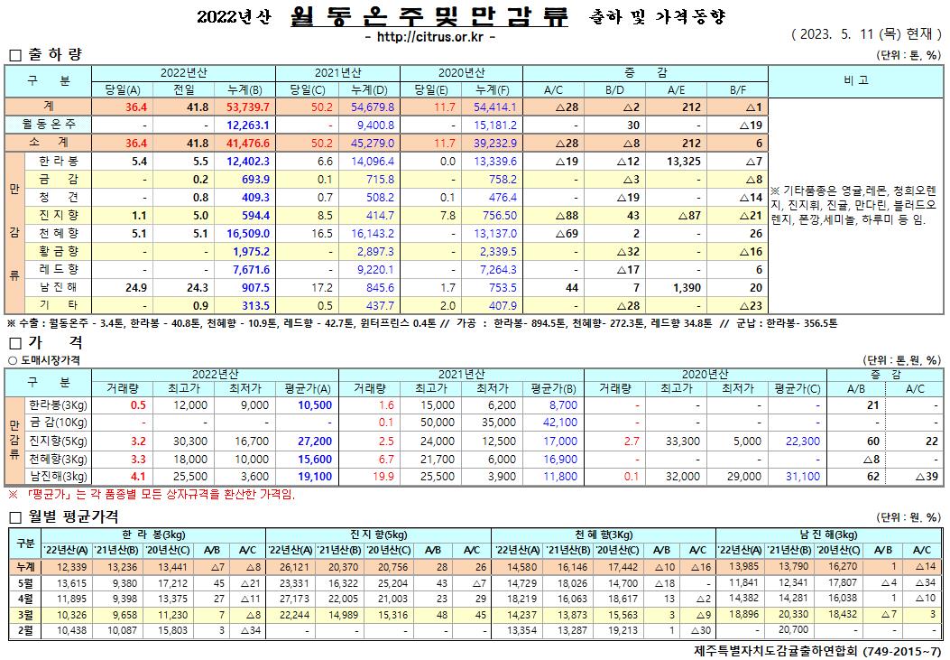 [월동&만감]2022년산 출하 및 가격동향(5/11)